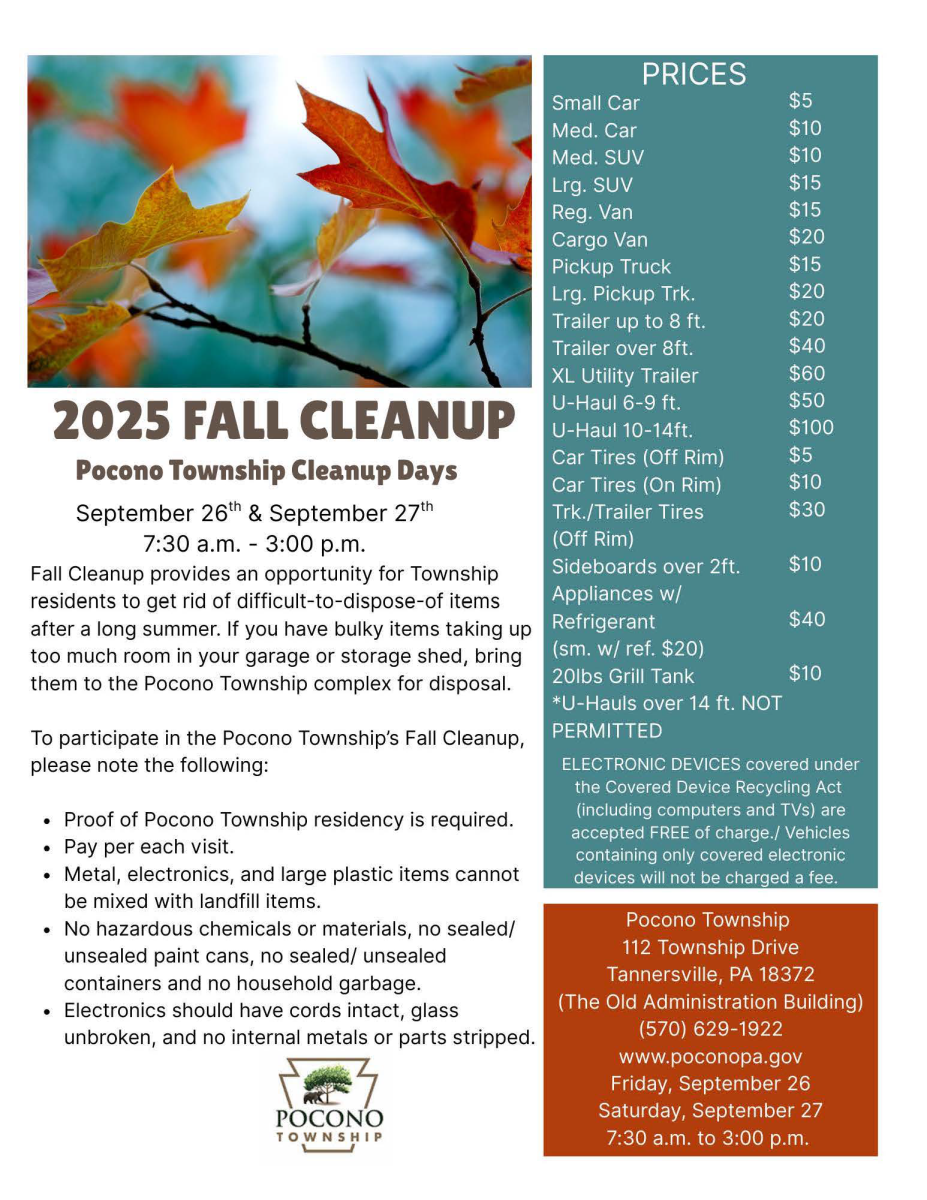 Pocono Township Fall Cleanup provides an opportunity for Township residents to get rid of difficult-to-dispose-of items before winter is upon us. If you have bulky items taking up too much room in your garage or storage shed, bring them to the Pocono Township Complex for disposal.