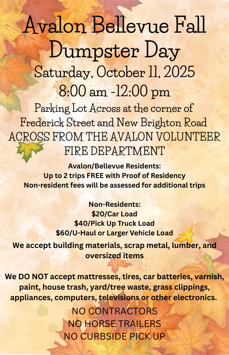 The semi-annual Avalon-Bellevue Dumpster Day will be held on Saturday, October 11, 2025, from 8:00 am - 12:00 pm.