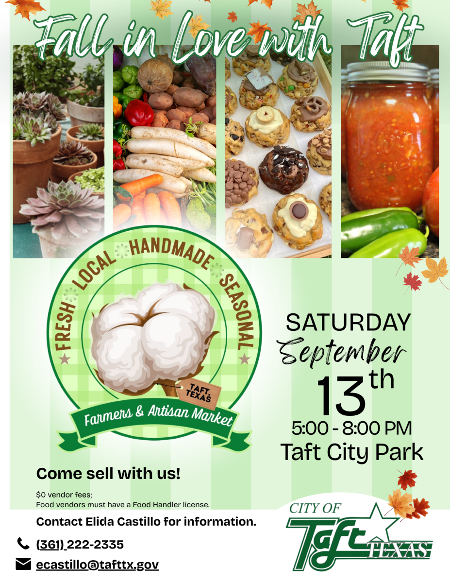 Come join in the fun at the Taft City Park for the Farmers and Artisan Market on Saturday, September 13th, from 5:00 – 8:00 PM!