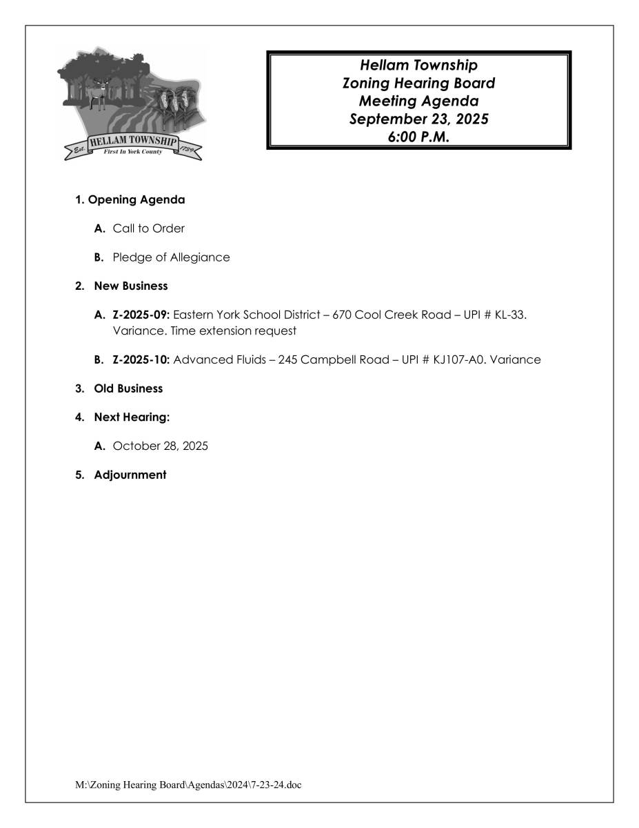 The Hellam Township Zoning Hearing Board meetings are regularly scheduled to occur the 4th Tuesday of the month. They take place in-person at the Hellam Township Municipal Complex, located at 35 Walnut Springs Road York, PA 17406, at 6PM. Meetings maybe be cancelled for various reasons, so please check our website for scheduling details, at www.hellamtownship.com