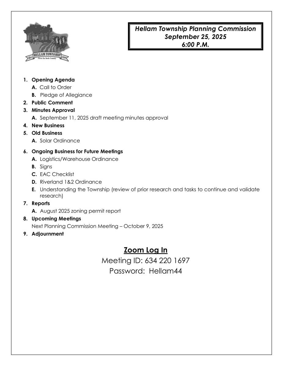 All meetings are now in person, but you may also join via Zoom. For accommodations, please contact the Township manager, Corina Mann, at cmann@hellamtownship.com.