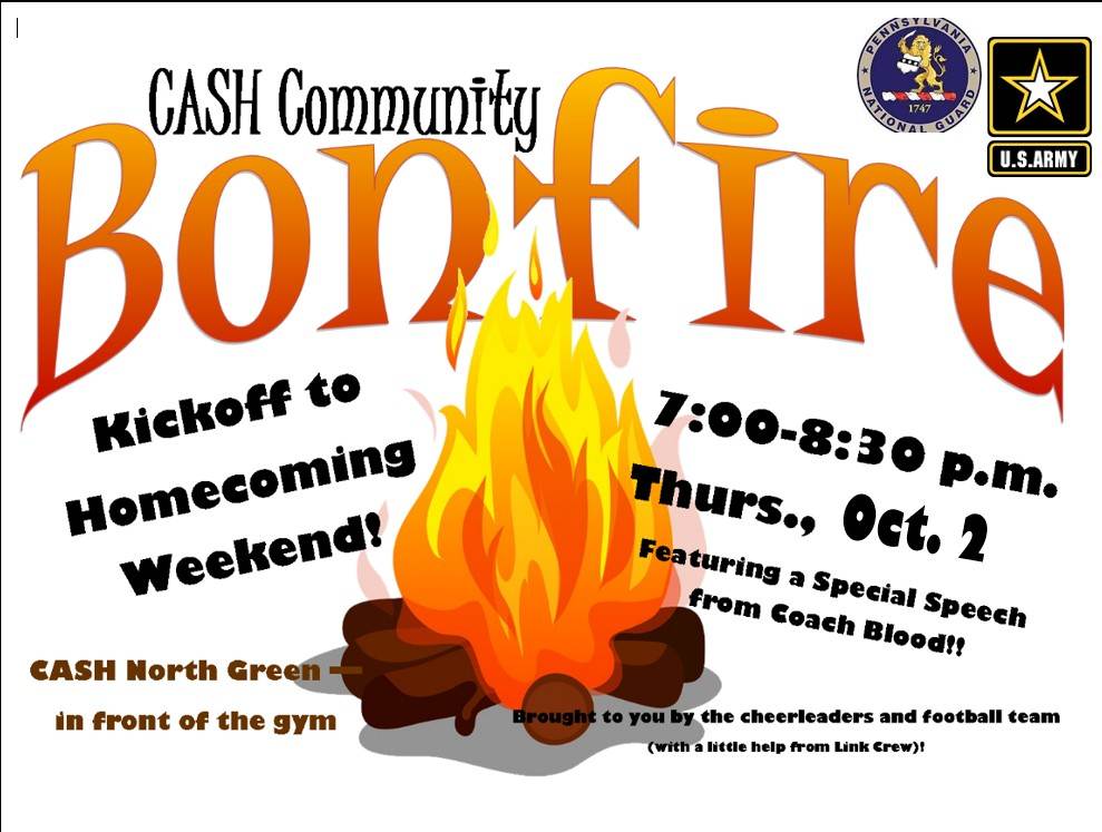 There will be a community bonfire to kick off homecoming weekend on Thursday Oct 2nd from 7pm-8:30 pm at Conneaut Area Senior High (in front of the gym).
