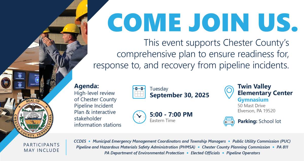 This event supports Chester County's comprehensive plan to ensure readiness for, response to, and recovery from pipeline incidents. High-level review of Chester County Pipeline Incident Plan & interactive stakeholder information stations.