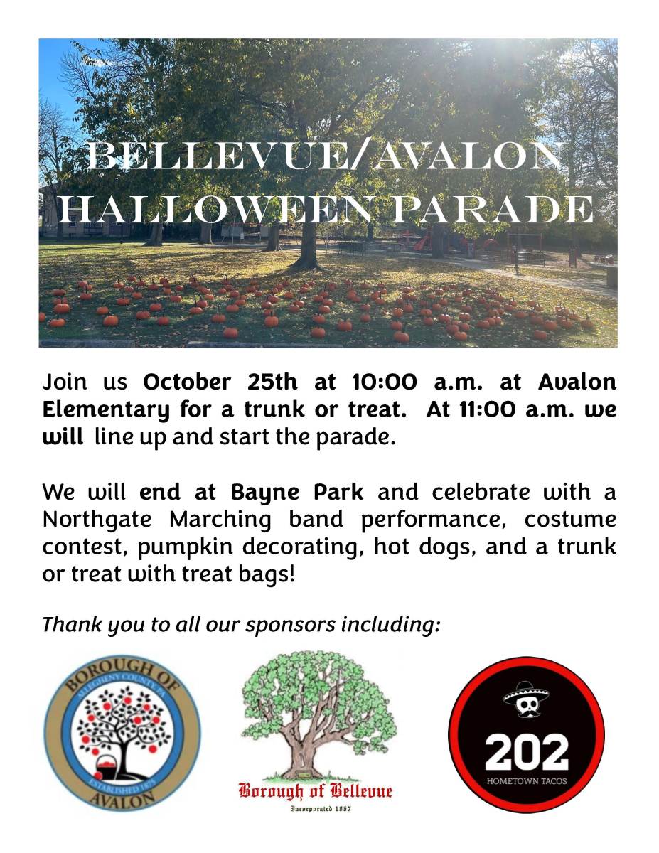 Avalon Borough will host a Trunk or Treat event immediately before the Bellevue-Avalon Halloween Parade. The parade will begin at Avalon Elementary School and end at Bayne Park in Bellevue.