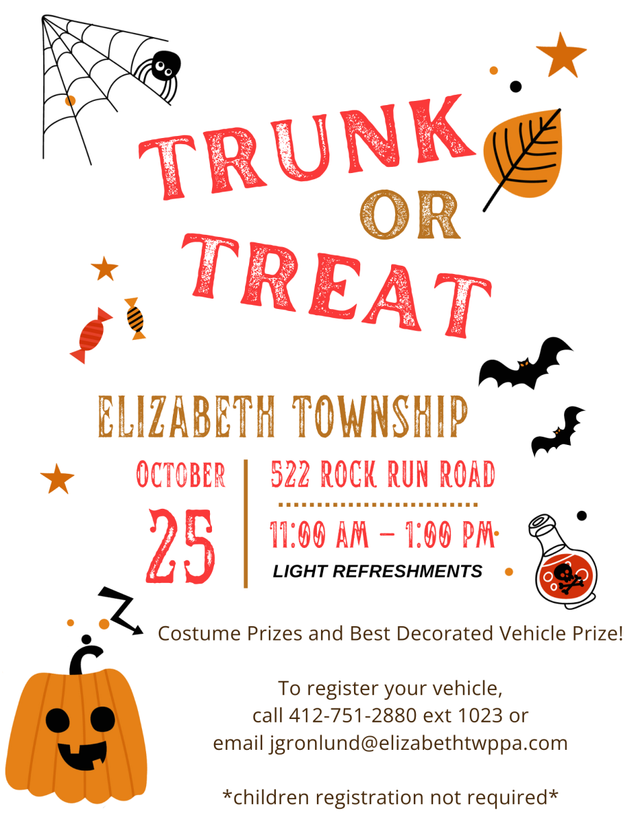 Join us for our annual Trunk-or-Treat Event on October 25th from 11:00am - 1:00pm at the Elizabeth Township Municipal Building!