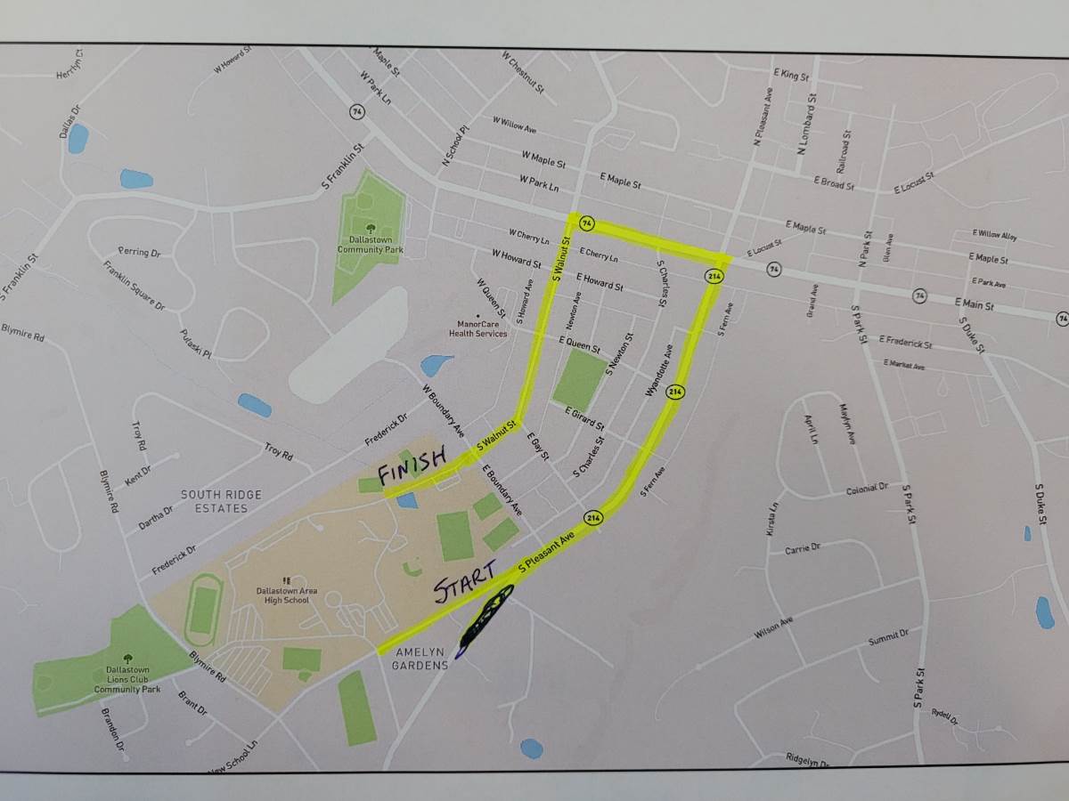The parade route goes as follows: Starts on New School Lane heading north toward Main Street. Turns left on Main Street heading west until the square at Walnut Street There again, it will turn left heading south back towards the high school where the parade will conclude.