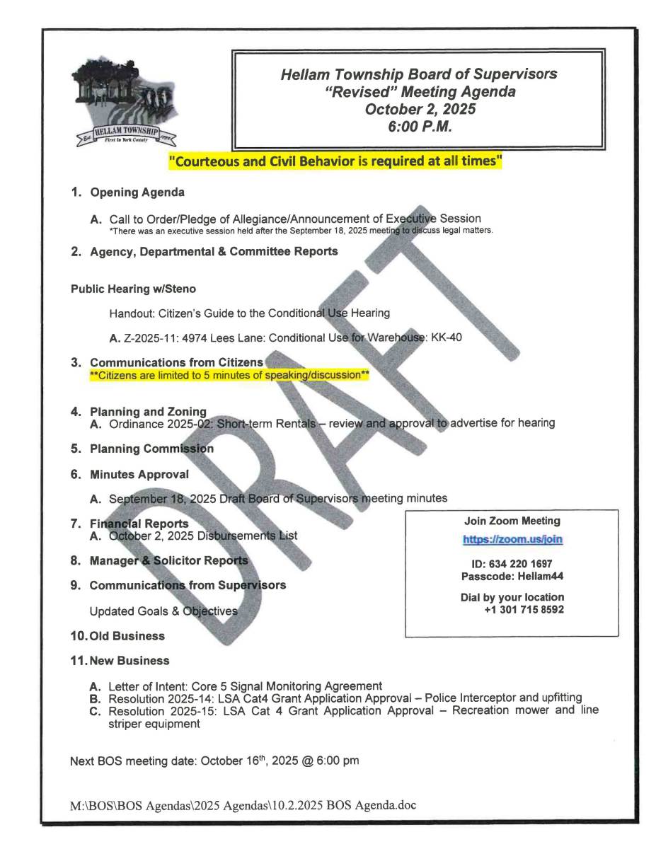 The Hellam Township Board of Supervisors meetings are regularly scheduled to occur the 1st & 3rd Thursday of the month. They take place in-person at the Hellam Township Municipal Complex, located at 35 Walnut Springs Road York, PA 17406, at 6PM. Meetings maybe be cancelled for various reasons, so please check our website for scheduling details, at www.hellamtownship.com