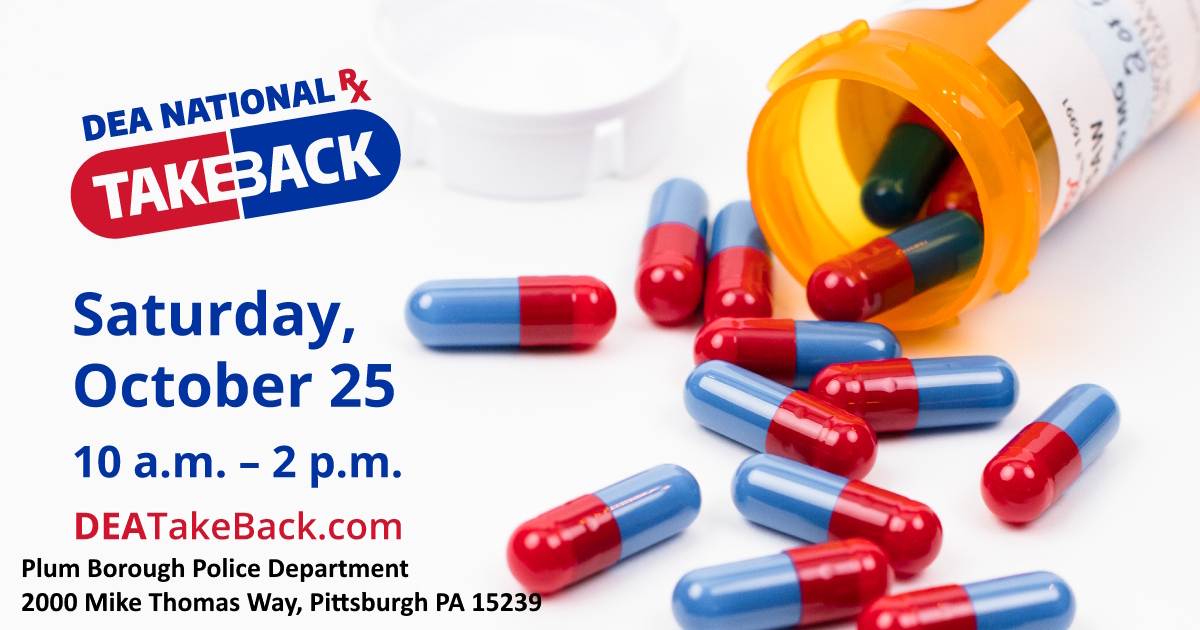 Dispose of your unneeded prescription medication on Saturday, October 25, 2025, from 10 AM - 2 PM at the Plum Borough Police Department. 2000 Mike Thomas Way, Pittsburgh, PA 15239!