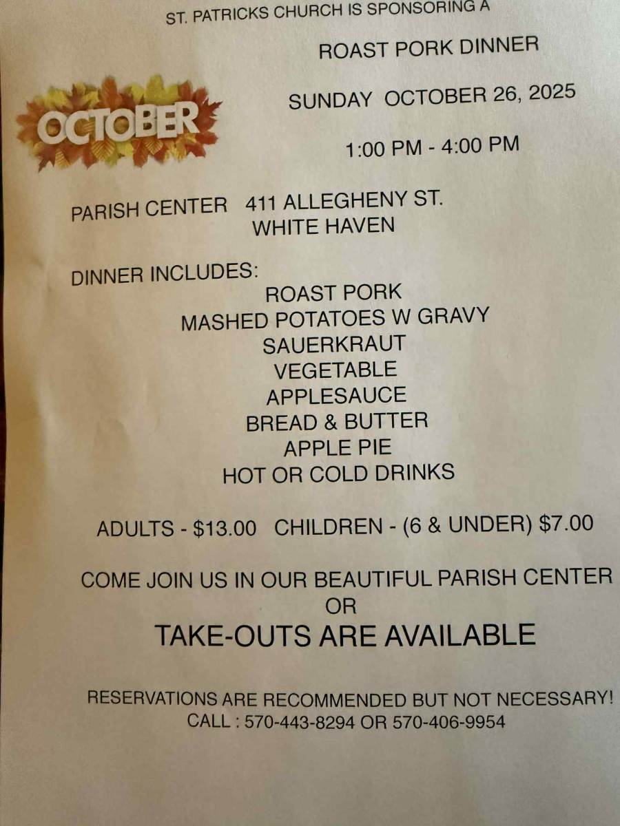 Roast Pork Dinner Sponsored by St. Patrick's Church