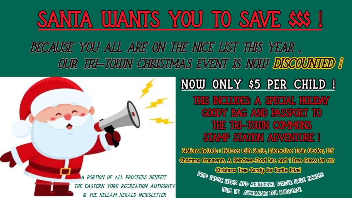 Join us for "A Tri-Town Christmas!" Tons of family-friendly fun, including pictures with Santa, a model train garden, Christmas crafts, raffle prizes, holiday-themed concessions and more! Now only $5 per child! A portion of the proceeds will benefit the Eastern York Recreation Authority and The Hellam Herald. The event is being held at The Tri-Town Commons, located at 68 Walnut Springs Road York, PA 17406, from noon until 3PM, November 22nd. Just in time for those family holiday photos. We Ho, Ho, Hope to see you there!