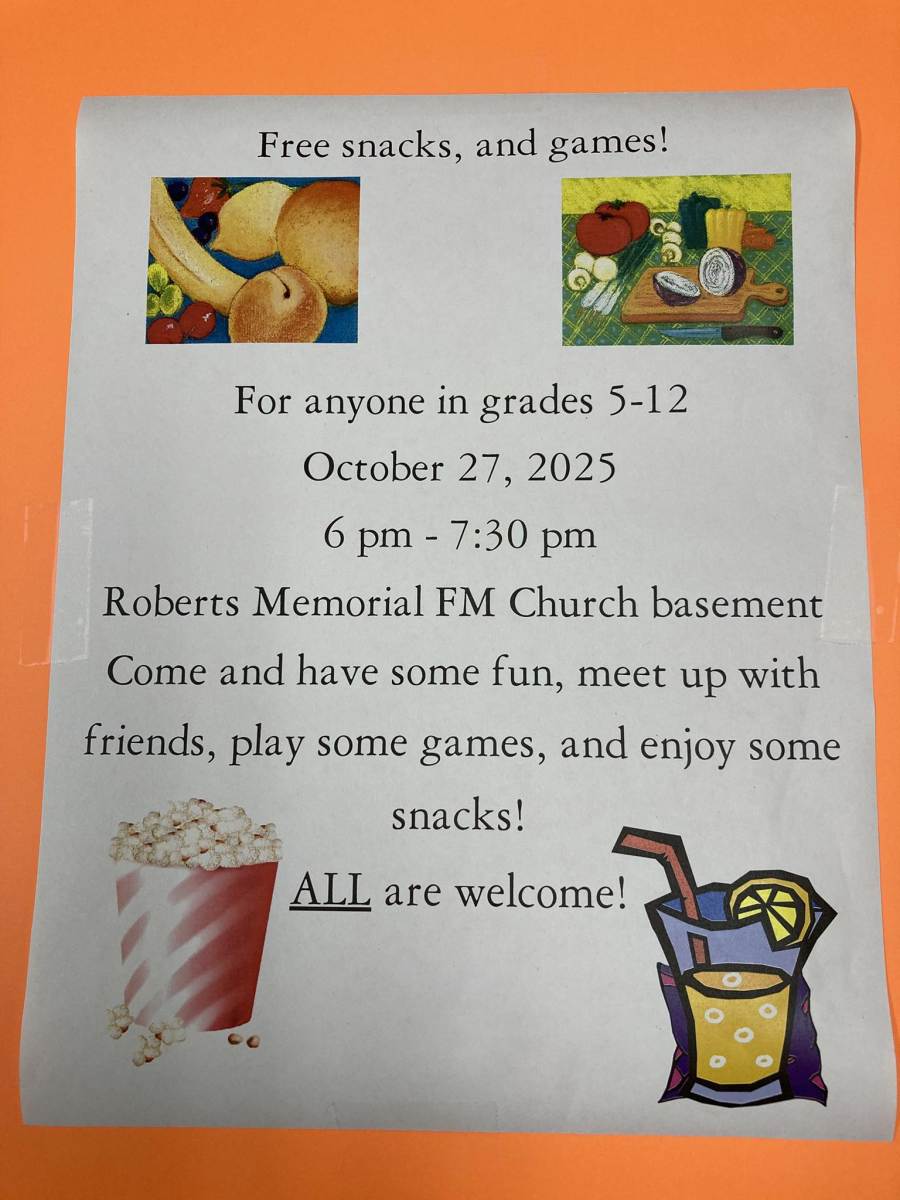 We are excited to once again have a good and game night at the Church for our community youth in grades 5-12 on Monday, October 27th, from 6-7:30 pm.
