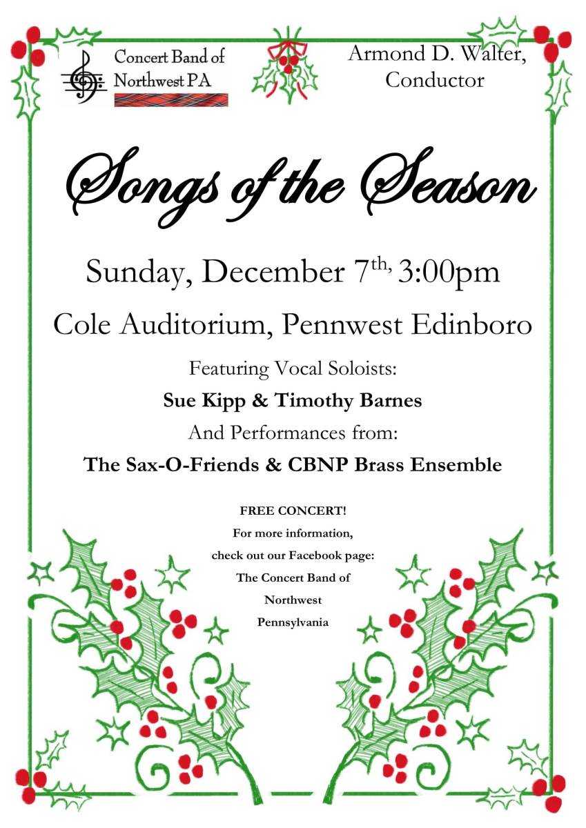 The Concert Band of Northwest Pennsylvania is performing our FREE annual holiday concert Songs of the Season on Sunday, December 7th at 3PM in the Cole Auditorium PennWest Edinboro campus.