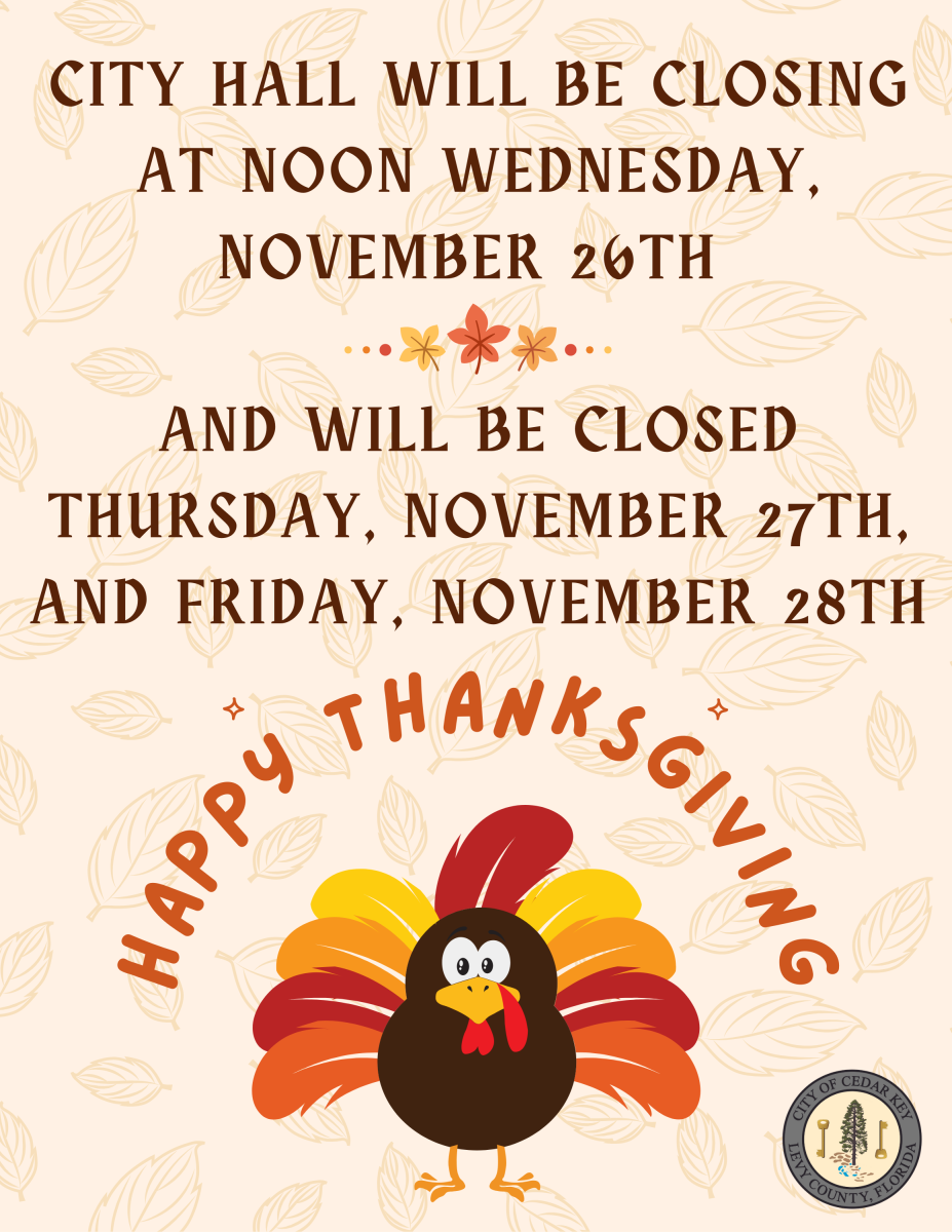 City Hall will close at 12:00 PM on Wednesday, November 26, and remain closed Thursday, November 27, and Friday, November 28.