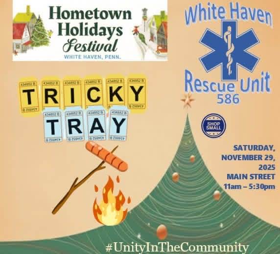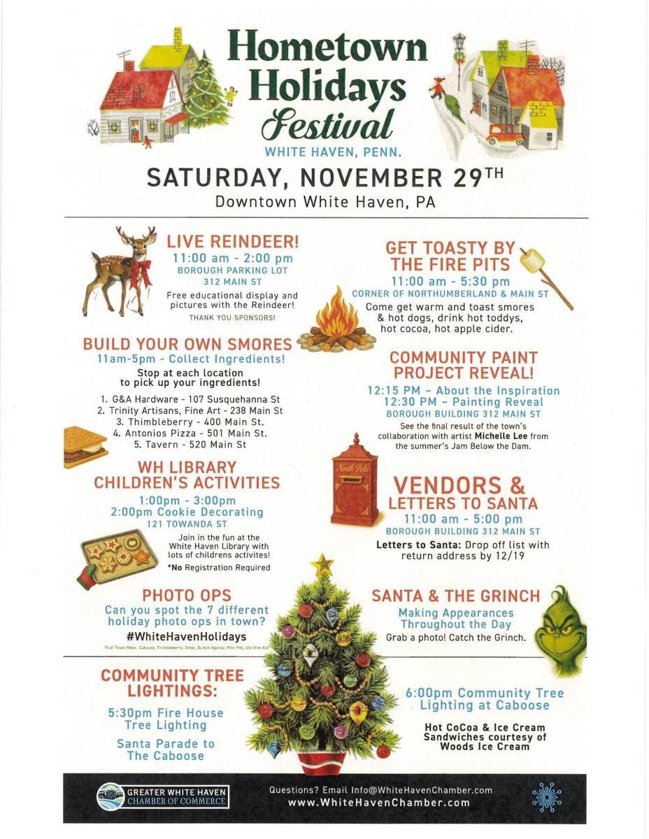 Shop local down town White Haven with holiday music, fun shopping and Santa’s reindeer. Followed by the tree lighting at 5:30 pm near the fire house & 6pm at the caboose!