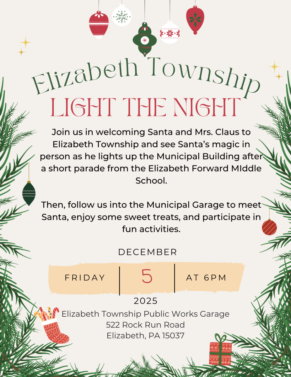 Join us in welcoming Santa and Mrs. Claus to Elizabeth Township and see Santa's magic in person as he lights up the Municipal Building after a short parade from the Elizabeth Forward Middle School.