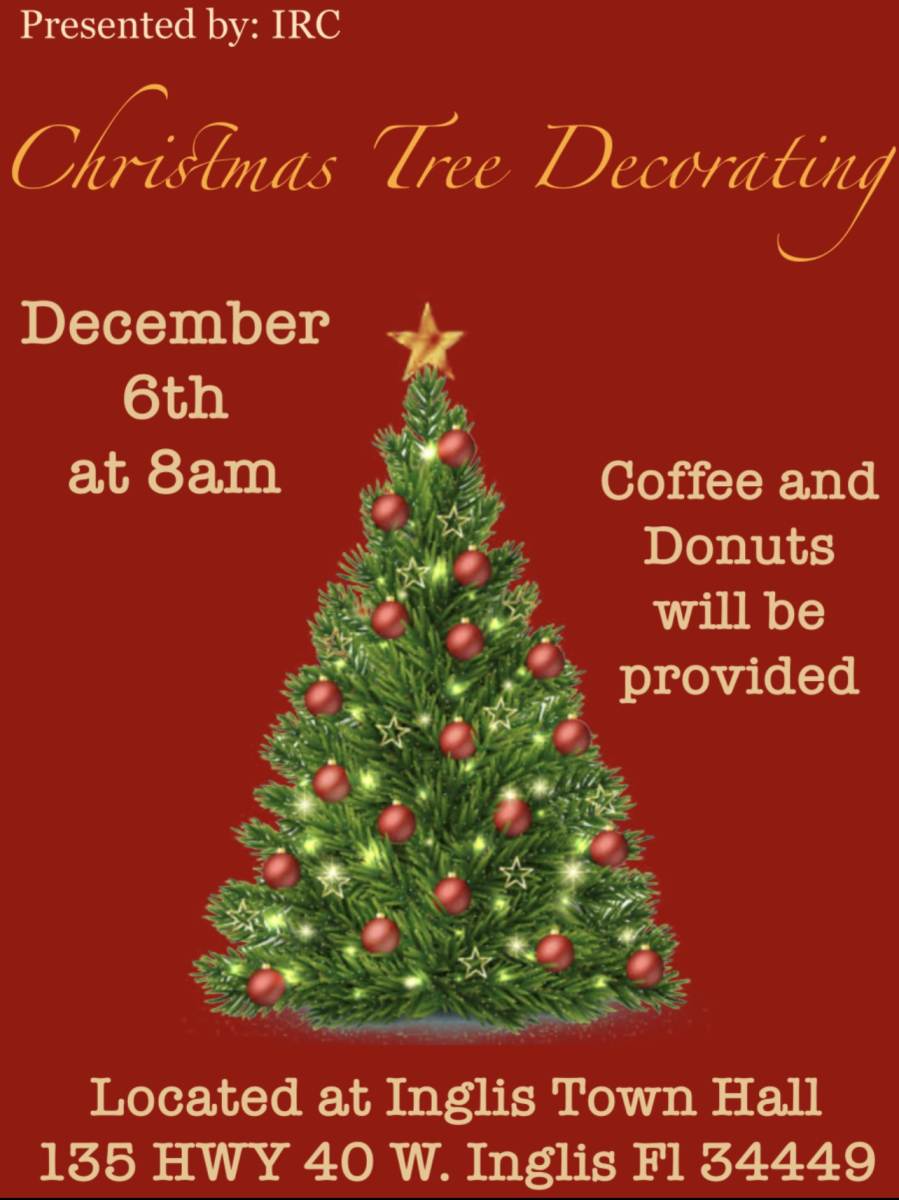 Join us on SATURDAY , December 6th at 8:00 AM as the Town of Inglis decorates the Christmas Tree in front of Town Hall.