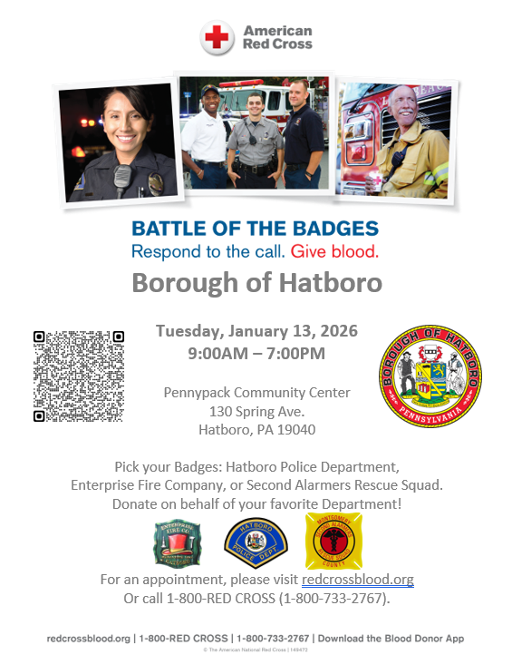 To reserve you spot please register at: https://www.redcrossblood.org/give.html/drive-results?zipSponsor=Hatboro%20Battle%20of%20the%20Badges