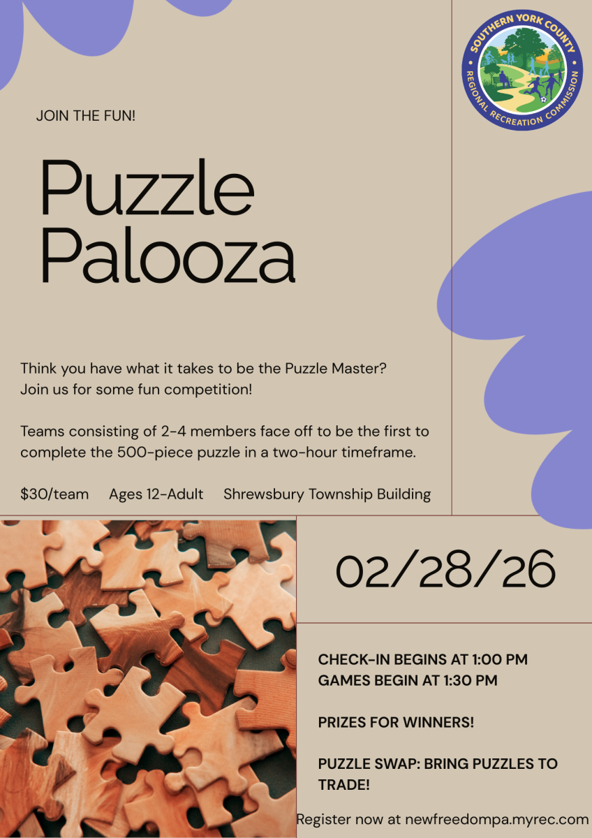 Come join the fun! Teams consisting of 2-4 people will race against each other to finish a 500-piece jigsaw puzzle. Teams will receive the same puzzle and have 2 hours to complete it.