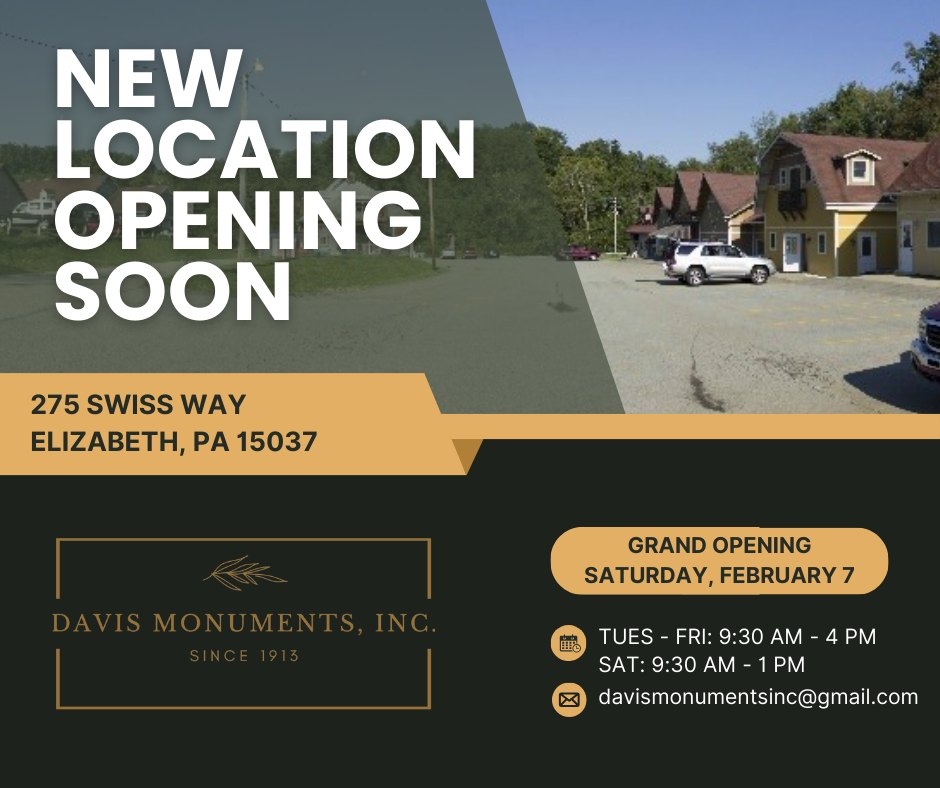 The Elizabeth Township Board of Commissioners are excited to welcome a new business to the township! Join us at the grand opening of Davis Monuments new location on February 7th at 10am at Swiss Alpine Village! There will be complementary snacks (including cupcakes from Thefamiliarcreations), coffee from Central Coffee, and a visit from Elizabeth Township's K-9 unit, Bear.