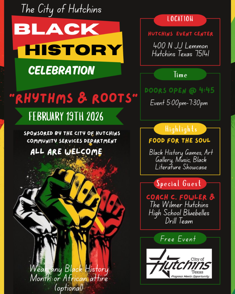 Join the City of Hutchins for a special Black History Celebration, “Rhythms & Roots,” on Thursday, February 19, 2026, at the Hutchins Event Center.