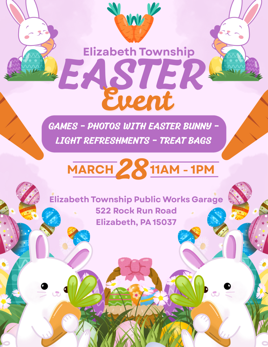 Join us in welcoming the Easter Bunny to Elizabeth Township on March 28th from 11am - 1pm in the Elizabeth Township Public Works Garage!.