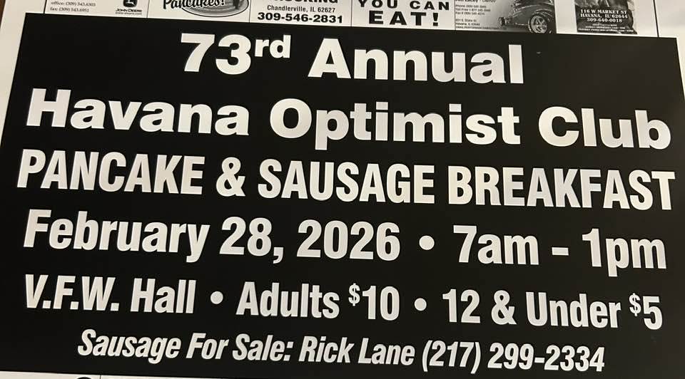 The 73rd Annual Havana Optimist Club Pancake & Sausage Breakfast will be held on Saturday, February 28, 2026 from 7 a.m. to 1 p.m. at the VFW Hall, 415 West Adams Street, Havana. Prices are Adults: $10 Kids: (12 and under) $5. Sausage may also be purchased at this time.