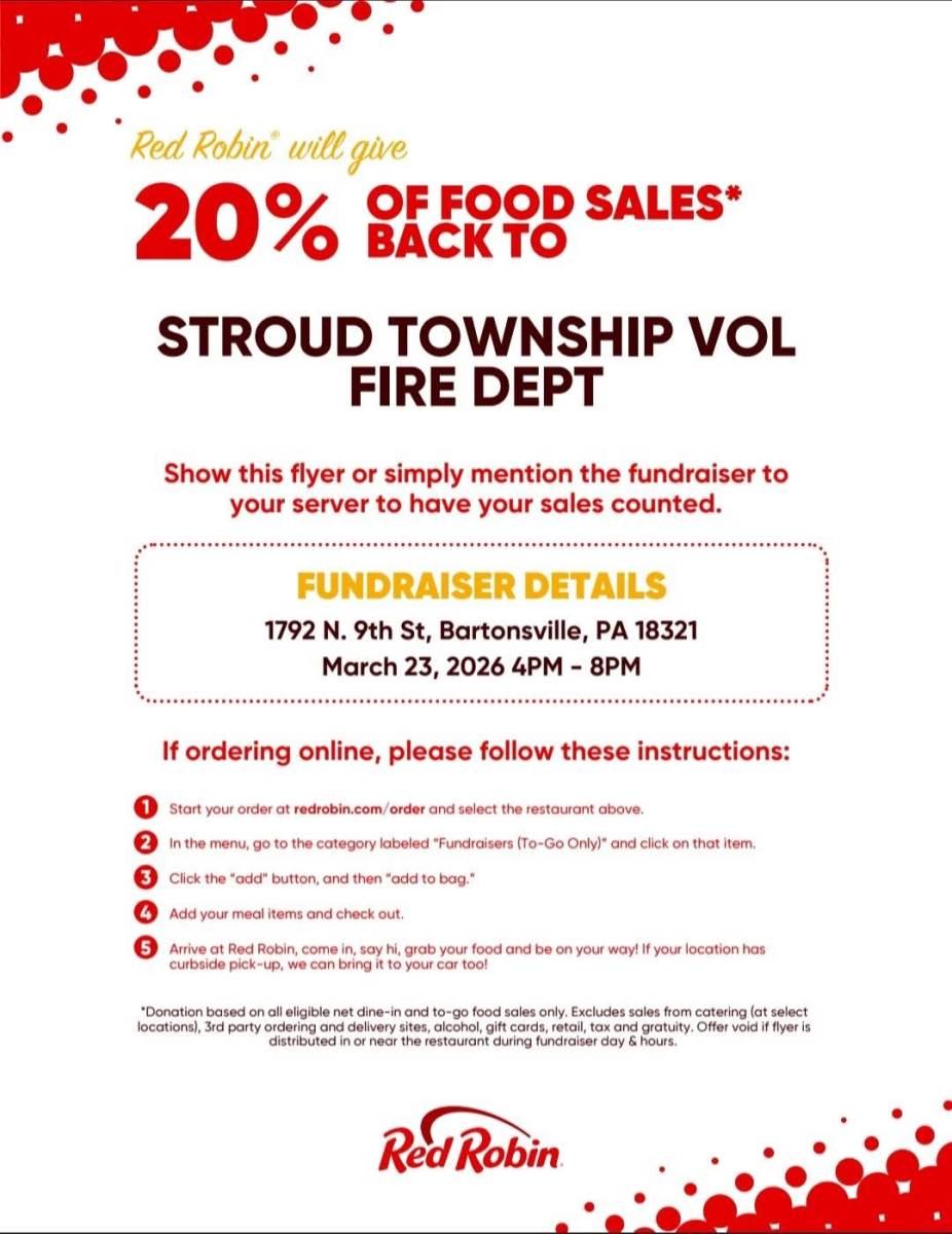 Mark you calendars! The Stroud Township Volunteer Fire Department has teamed up with Red Robin for a fundraiser night on March 23rd.