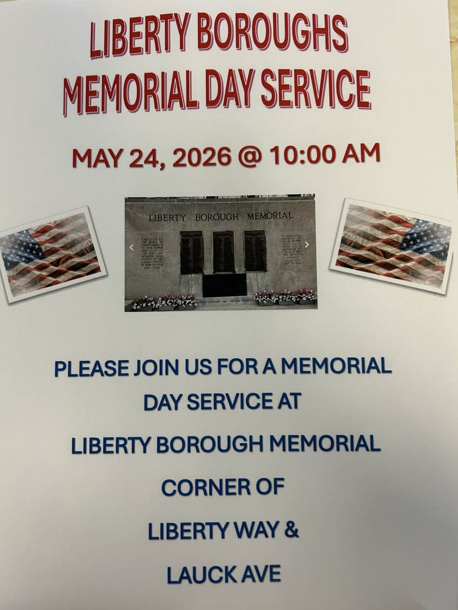 PLEASE JOIN US FOR LIBERTY BOROUGH'S MEMORIAL DAY SERVICE SUNDAY, MAY 24, 2026 @ 10:00 AM @ LIBERTY BOROUGH MEMORIAL THE CORNER OF LIBERTY WAY AND LAUCK AVE.