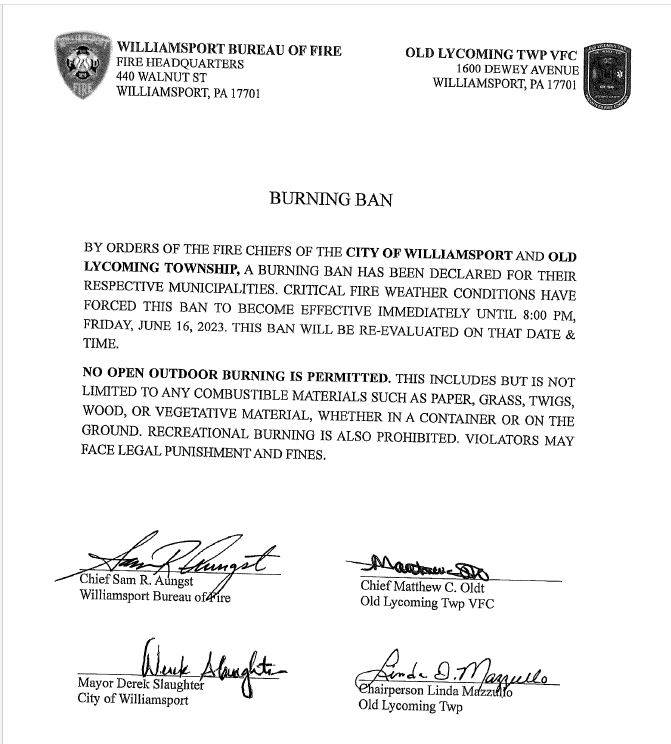 Old Lycoming Township Volunteer Fire Company has issued a Burn Ban effective Immediately until 8:00 PM Friday, June 16, 2023.