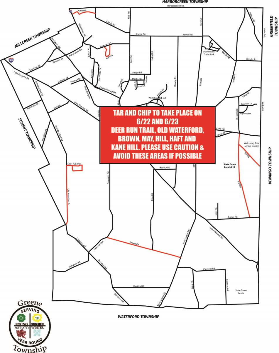 Please be advised that Suite Kote Corporation will be sealcoating(tar & chipping) the following roads on June 22nd and 23rd. Deer Run Trail, Old Waterford, Brown, May, Hill, Haft and Kane Hill. Please use caution and avoid these areas if possible.