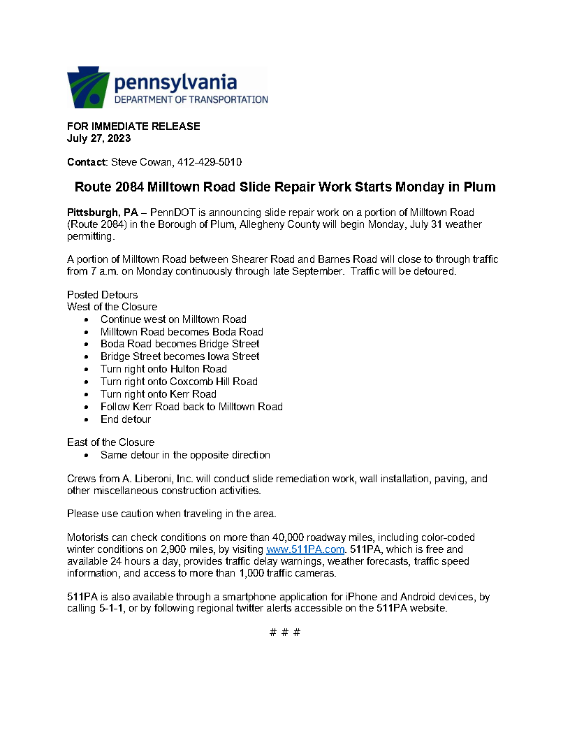 Pittsburgh, PA – PennDOT is announcing slide repair work on a portion of Milltown Road (Route 2084) in the Borough of Plum, Allegheny County will begin Monday, July 31 weather permitting.