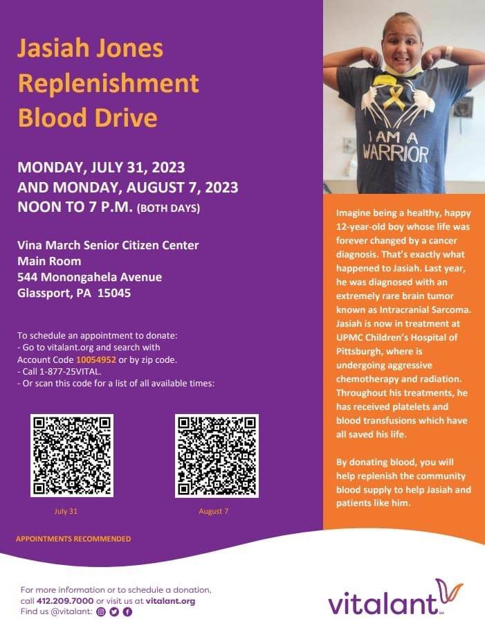?? Donating blood saves lives in our community. There are two blood drives happening on Monday, July 31 and Monday, August 7 at The Vina March Senior Citizens Center in Glassport Borough. See the flyer below for details and register here: https://bit.ly/44Eg4wu