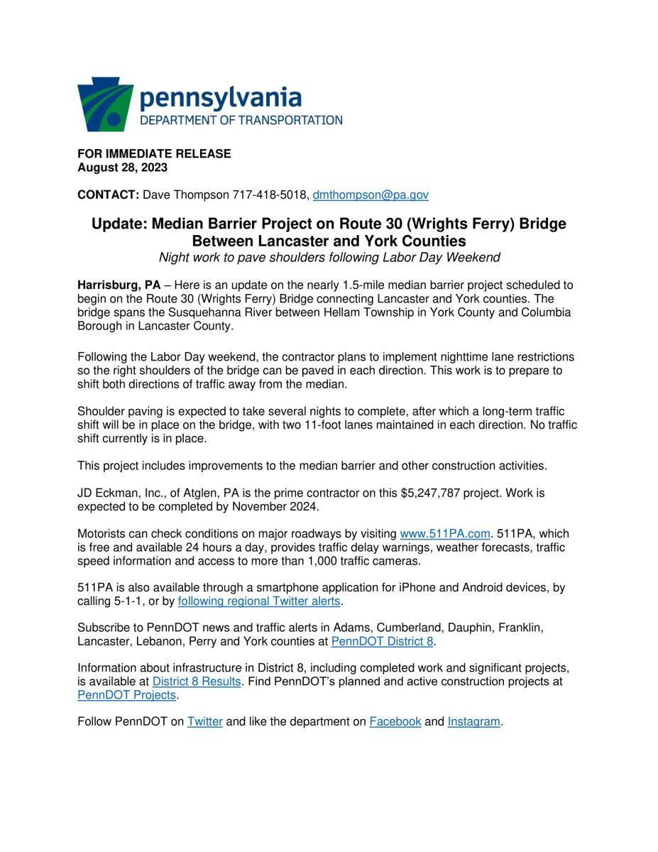 PennDOT Announcement-Median Barrier Project on Route 30 (Wrights Ferry) Bridge