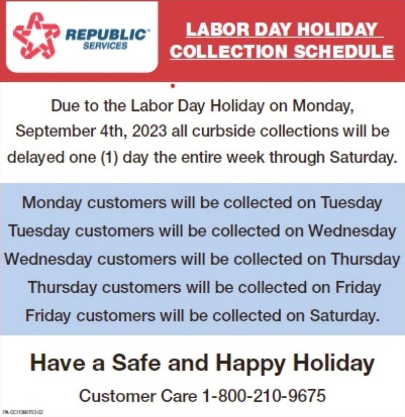Please be advised that refuse/trash pick-up is Thursday this week due to the Monday holiday.