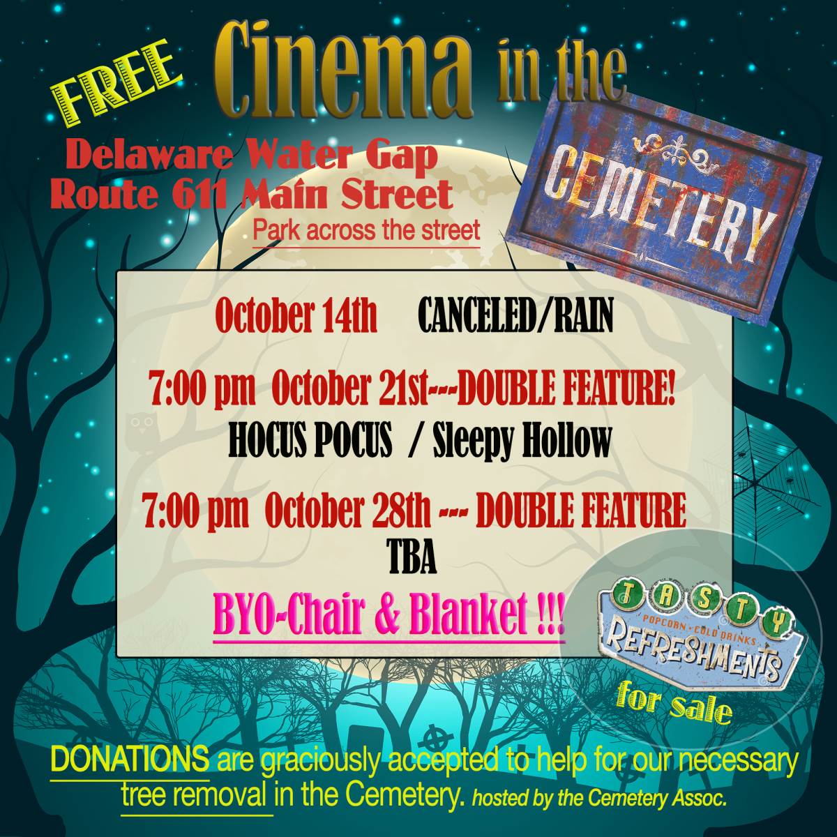 The movies are free, refreshments will be sold and donations are graciously excepted for the maintenance of the cemetery.