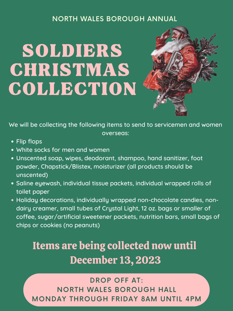 It's that time of year again, and North Wales Borough will be collecting items to send to servicemen and women overseas. Please see the attached flyer for the items we are collecting. Items will be collected from now until Wednesday, December 13th. Items can be placed in a bag or box and dropped off at North Wales Borough Hall between 8am and 4pm, Monday through Friday. Borough Hall is located at 300 School Street, North Wales.