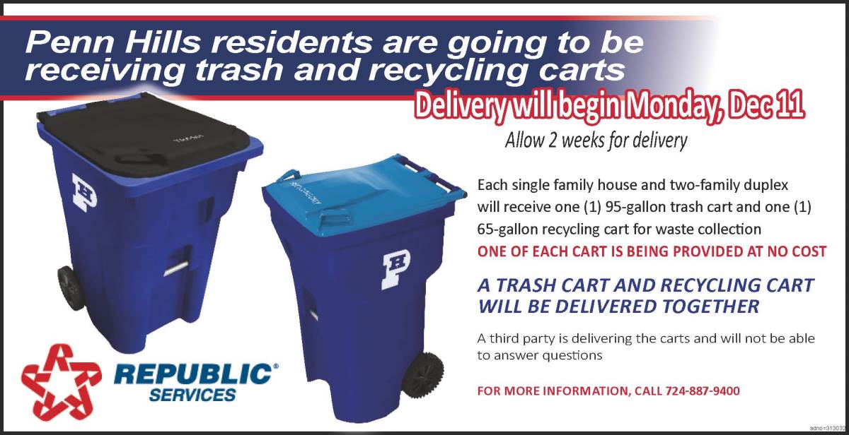 Penn Hills residents are receiving new trash and recycling carts. Each single-family home and two-family duplex will receive one 95-gallon trash and one 65-gallon recycling cart. The use of carts that are specifically manufactured for waste collection has proven to have benefits for residents as well as waste employees. Residents enjoy cleaner, easier and efficient collection. The risk of injury to employees is reduced.