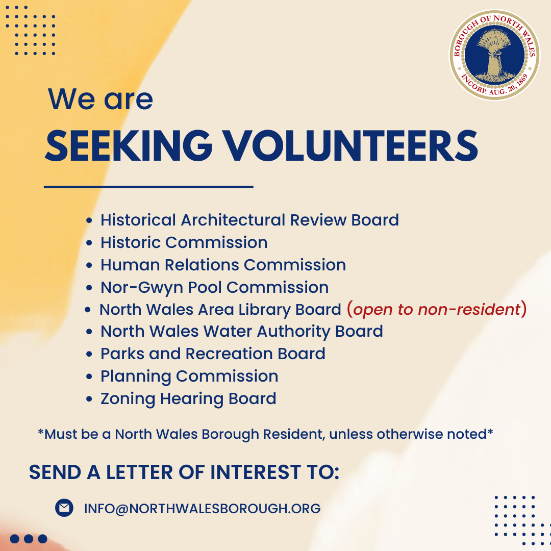 We are seeking volunteers to serve the community on various boards and commissions. Please see attached flyer for a list and send a letter of interest to info@northwalesborough.org.