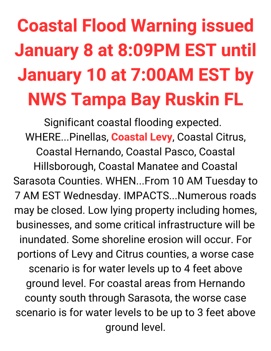 A Coastal Flood Warning has been issued. Significant coastal flooding is possible with a worst-case scenario of up to 4 feet above ground level.