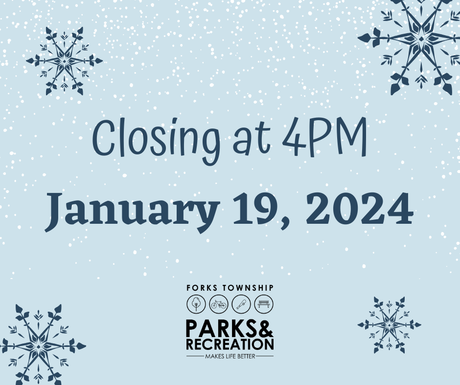 Due to wet roads, lots and the potential for flash freezing, the Forks Township Community Center will be closing at 4PM today, January 19, 2024.