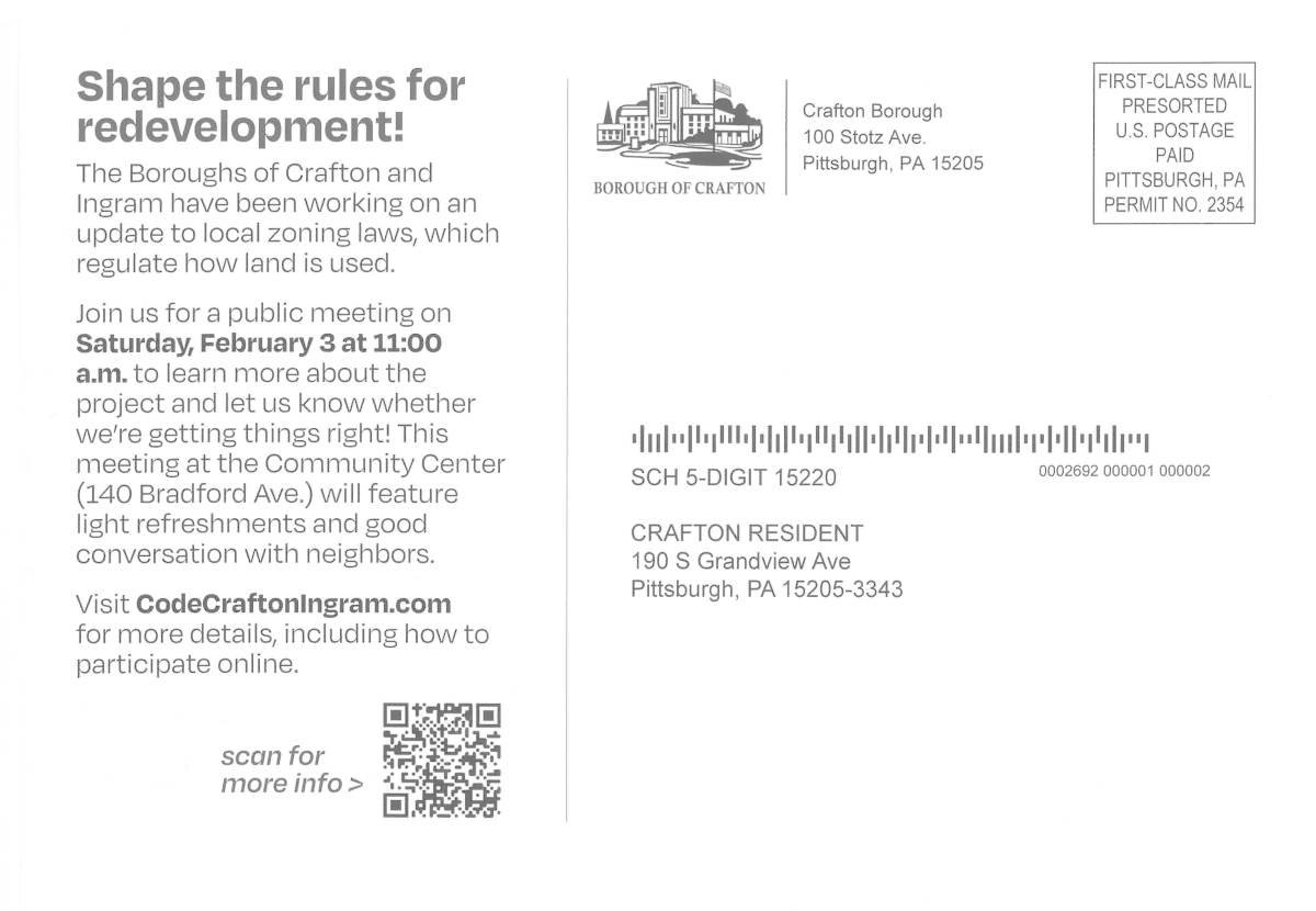This notification was posted by Borough of Crafton. Borough of Crafton is solely responsible for this notification and unless specifically indicated, no other community or individual utilizing Savvy Citizen is sponsoring, responsible for, or endorsing this notification.