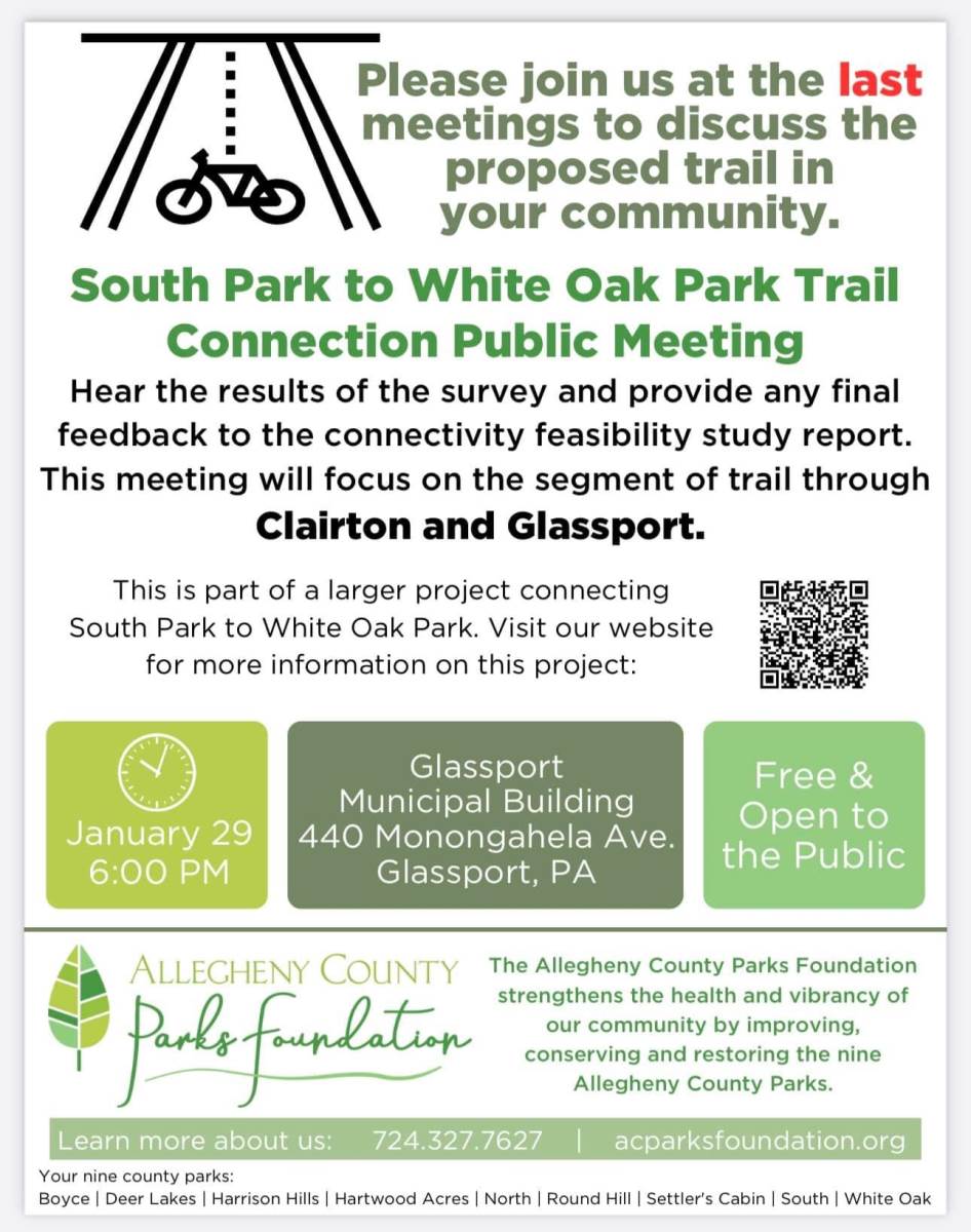 The South Park to White Oak park trail Connection meeting will be tomorrow Monday, January 29th at 6:00pm. It will be held at the Glassport Municipal Building. We encourage everyone to come and give any feedback they would have on this topic.