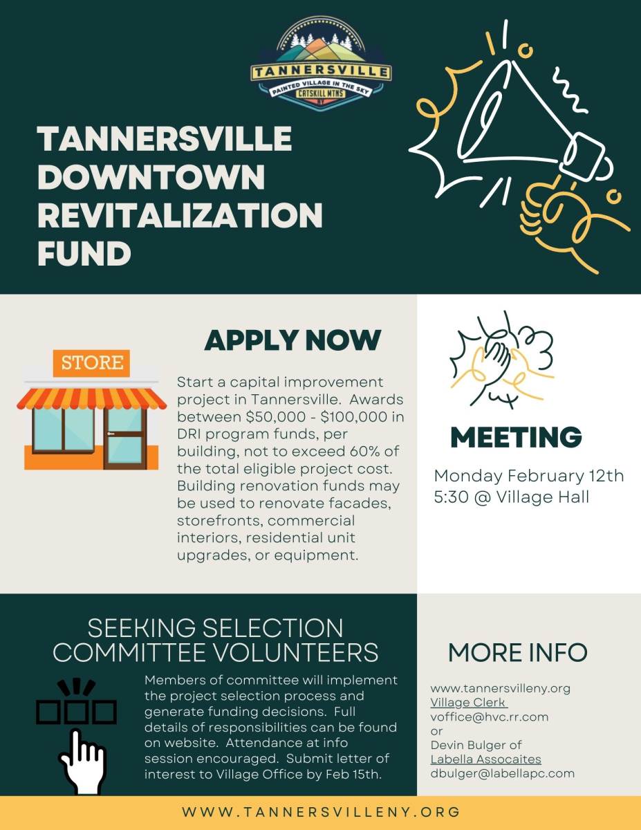 Notice is herby given that the Village of Tannersville is seeking letters of interest for individuals to become volunteer members of the Downtown Revitalization Fund Selection Committee. Members of said committee will implement the project selection process and generate funding decisions. The Committee should include a diverse group with relative experience and cannot include elected officials or those that cannot meet the conflict-of-interest policy. Individuals with experience in grants, finances, building/planning, construction, engineering, environmental, historical, economic development, business, and community sense of place are encouraged to apply but not required.