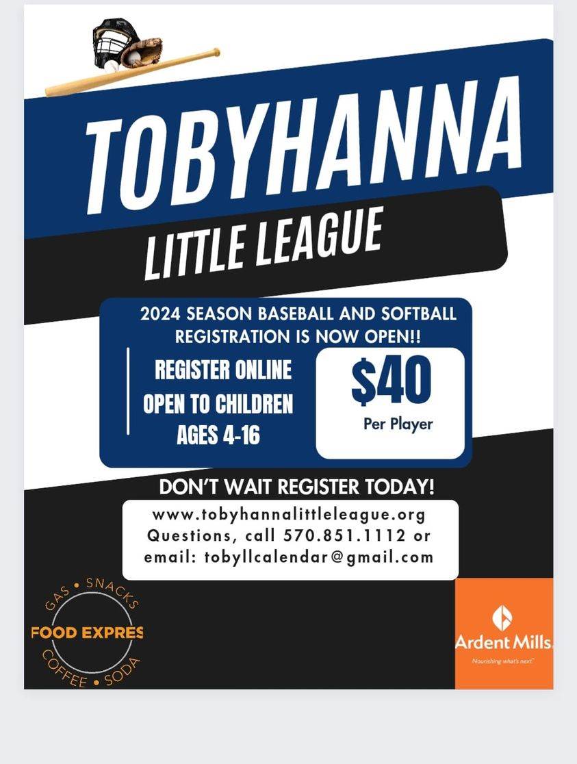 Tobyhanna Little League is now accepting registrations for the 2024 Baseball and Softball Season. The cost per player is $40.00 and includes everything except a pair of cleats and a baseball mitt. Batting helmets for teams are provided, but we recommend that each player purchase their own if possible.