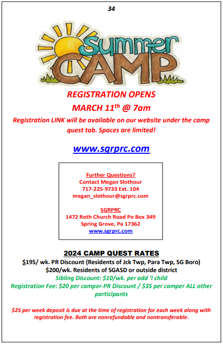 Spring Grove Regional Parks Summer Camp registration opens Monday, March 11th at 7:00 AM. Registration LINK will be available on our website under the camp quest tab. Spaces are limited! https://www.sgrprc.com/