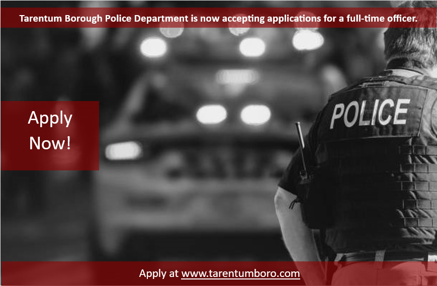 Tarentum Borough PD is now accepting applications for a full-time Police Officer.