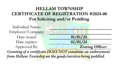 This notification was posted by Hellam Township. Hellam Township is solely responsible for this notification and unless specifically indicated, no other community or individual utilizing Savvy Citizen is sponsoring, responsible for, or endorsing this notification.