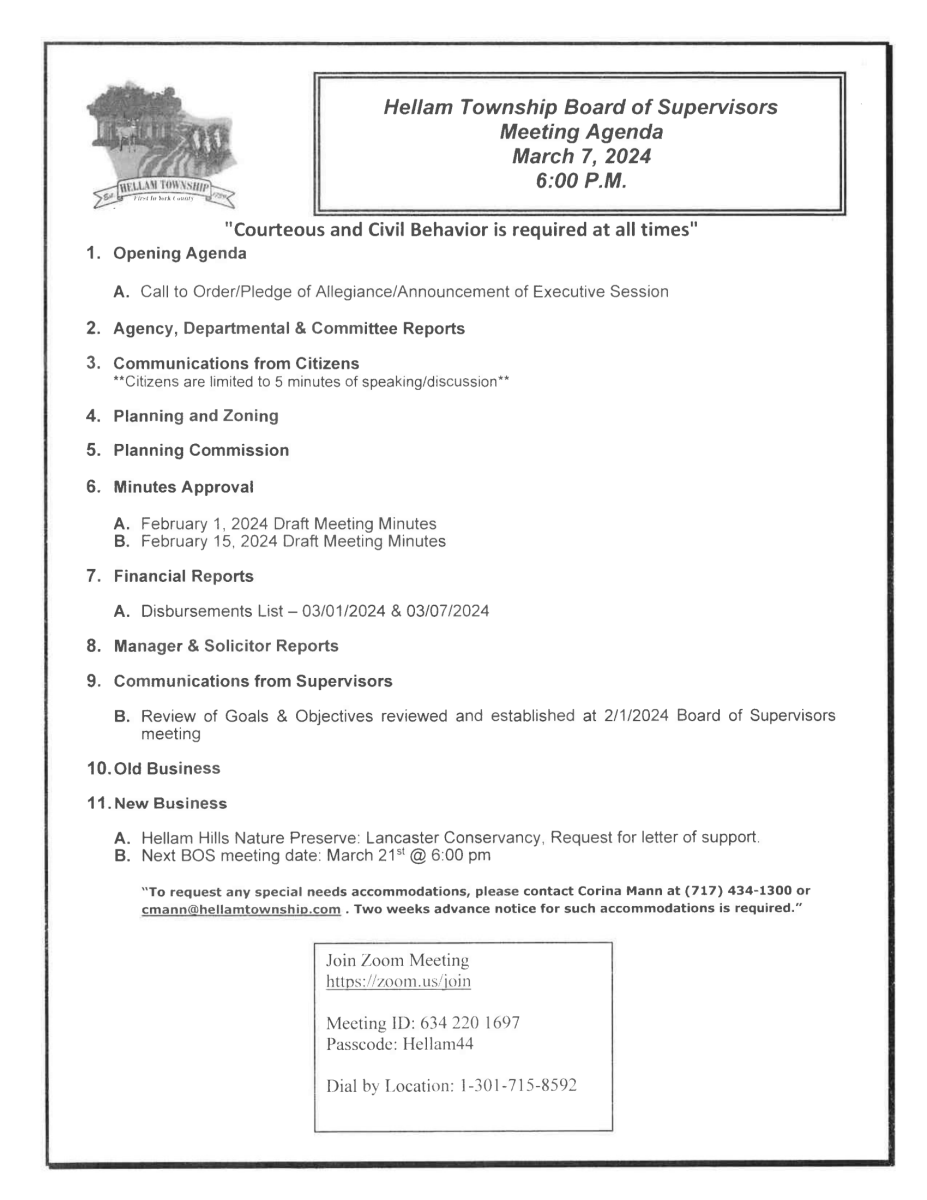 This notification was posted by Hellam Township. Hellam Township is solely responsible for this notification and unless specifically indicated, no other community or individual utilizing Savvy Citizen is sponsoring, responsible for, or endorsing this notification.