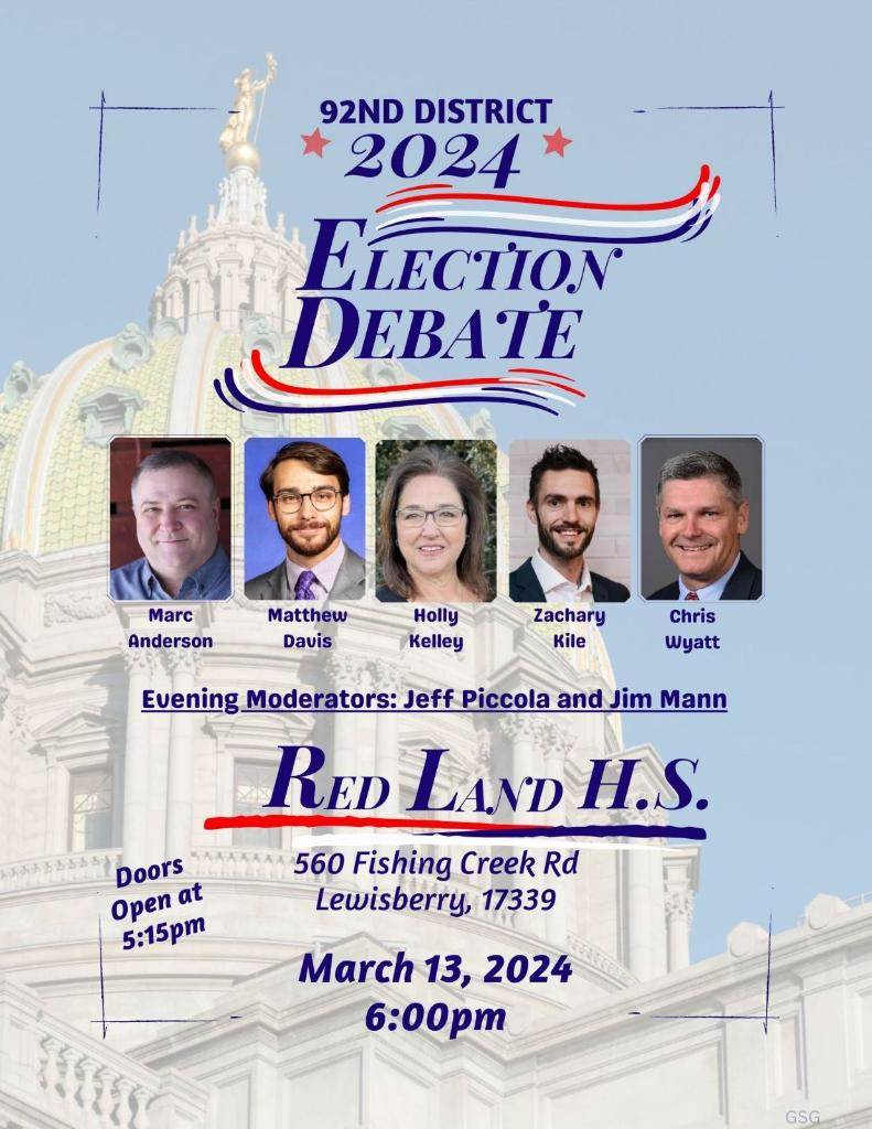 The 92nd District 2024 Election Debate will be held at Red Land High School. Please see attachment for more details.