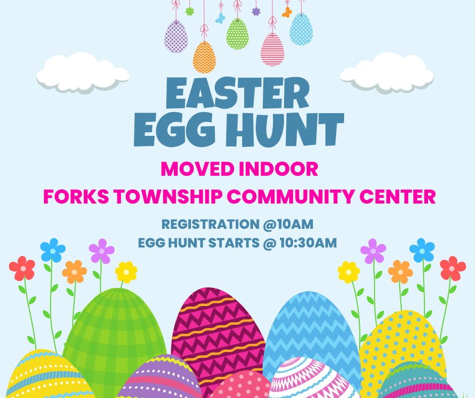 Due to the weather forecast, the Forks Township Easter Egg Hunt is moving inside the Community Center Saturday, March 23. Registration begins at 10AM. Egg Hunt begins at 10:30AM.